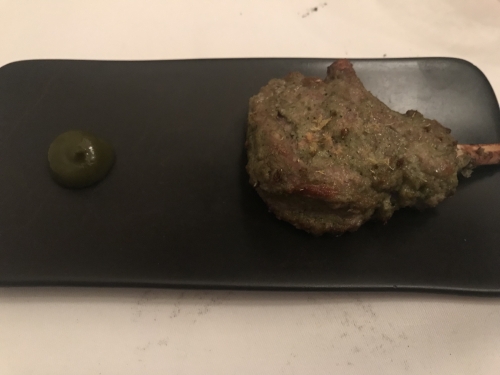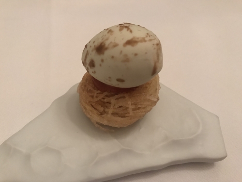 豪華なコース料理のしめを飾るのは、我らが親しむ「卵かけごはん」のインド創作版。緑のソースはほうれん草のカレーです。カレーと生卵の黄身を混ぜて、インド米と一緒に堪能します。