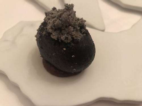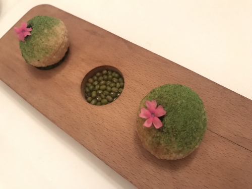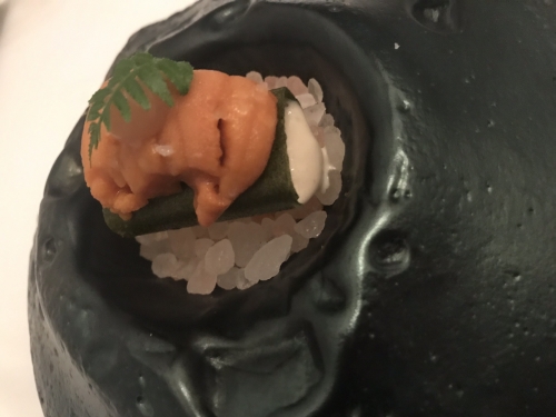 そして、うにの下、海苔に巻かれている白いソースは、なんとなんとアイスクリーム。口にふくんだ瞬間の衝撃、そしてそのあとに広がる深みに、思わずうなってしまいました。