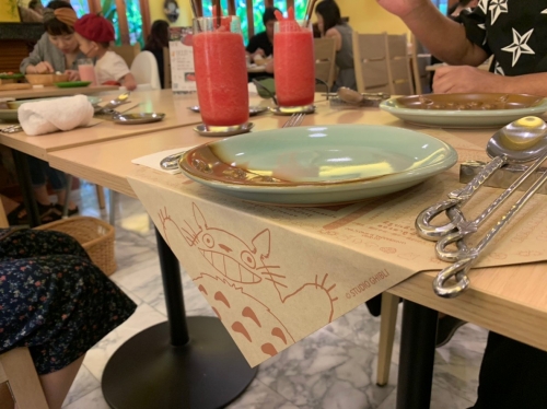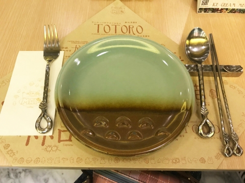 トトロの絵が描かれているペーパーのランチョンマットがお客さんを迎えてくれます。お皿やフォーク、スプーン、箸の細部まで装飾がされています。