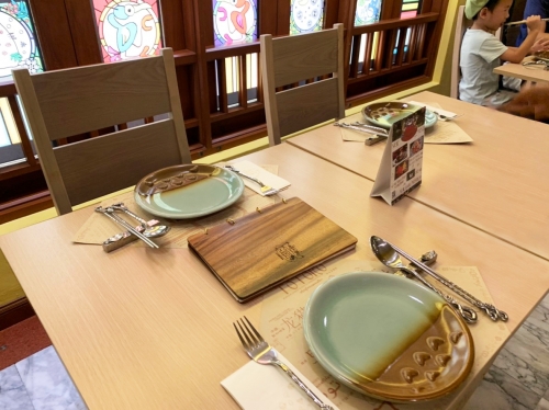 ジブリらしい優しい内装の店内。ステンドグラス調の壁やテーブルメイクなど、食事をする前からドキドキが止まりません。
