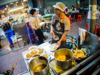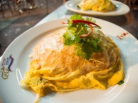写真:sosuke 卵包みパッタイ(70バーツ/約240円) |  写真:sosuke 道にまではみ出した厨房。こちらではパッタイを卵に包んでいます。 |  写真:sosuke マッサマンカレー(165バーツ/約570円) |