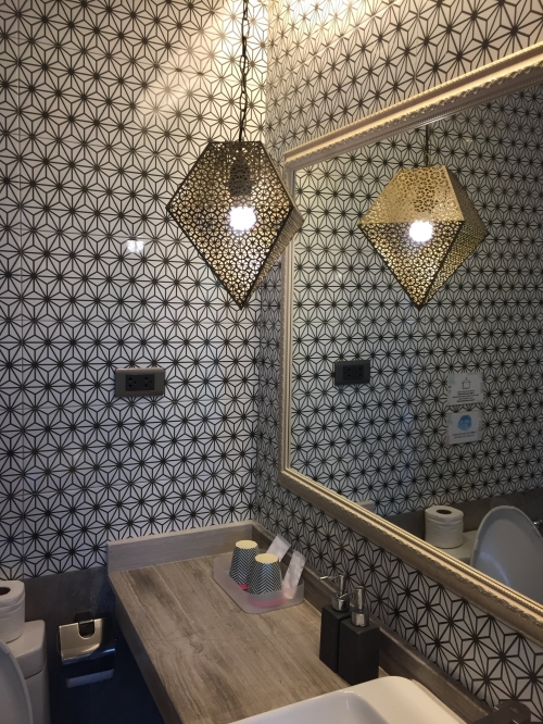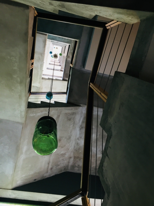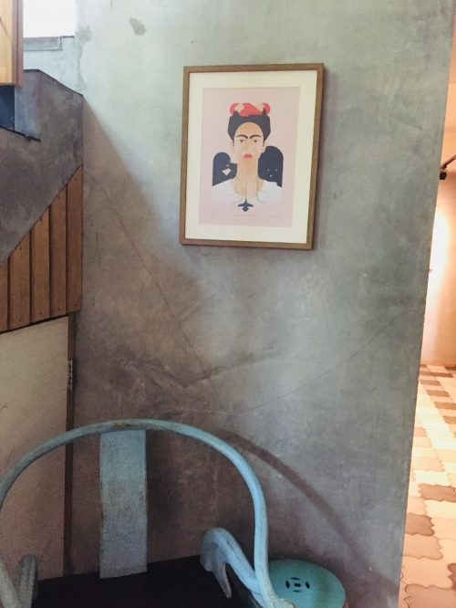 こじんまりとしたホテルですが、内装にもこだわりが光ります。ここはエレベーター横の階段へと続く吹き抜けのエリア。メキシコの有名な女性画家である「フリーダ」の肖像画が印象的です。また、下から上を見上げると、階段が繋がるスペースに、メイソンジャーのガラス瓶を使ったランプが。