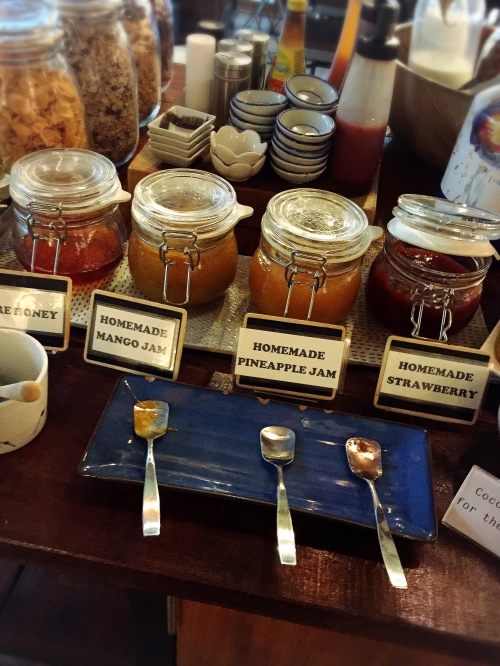 朝食ステーションに綺麗に盛り付けされたフルーツやパンなどを、各自セルフサービスで自由に取り分けていただく方式です。パンやヨーグルトに加えて食べる手作りのジャムは、ガラス瓶で統一されていておしゃれです。