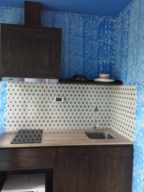 写真左は、幾何学文様が特徴のバスルーム。シンプルにゴールドと白で統一されたセンスの光るデザインです。写真右は、ミニキッチンスペース。冷蔵庫も設置されているので、冷たい飲みものも保存できますよ。