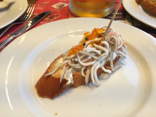 どのピンチョスも値段が1つ2〜300円程度なので、どんどん食べられます。日本の回転寿司や焼き鳥にとても似た感覚があります(串の数で値段を計算するピンチョスバルもあるそうです)。