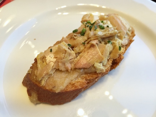 「グーラス(Gulas)」はシラスウナギに似せた加工物のことで、バルセロナのピンチョスバルでほぼ必ず目にする食材です。「チャペラ」では、クリームチーズ、サーモン、イクラとともに提供されます。
