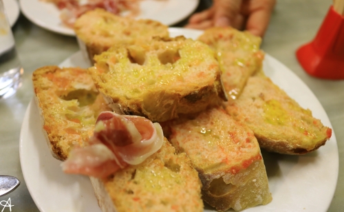 Pa amb Tomaquet(バケットに潰したトマトとオリーブオイルをかけたもの)にアンチョビやハモンイベリコをのせて食べるのが、オススメの食べ方とのことです。近くの席の人同士で注文した料理を分け合うのも楽しみ方の一つです。