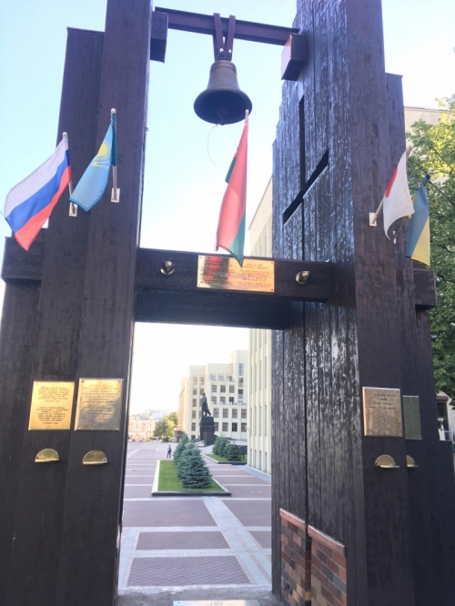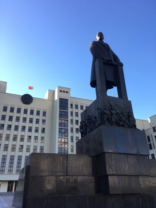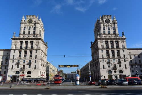 ミンスク駅を背にして立つと、正面の幹線道路を挟んでシンメトリーに配置されたビルがあります。スターリン主義建築という形態の建物。搭には、当時の党首、農家、エンジニア、兵士の彫刻が施されています。このようなアンサンブルのスタイルは珍しく、ミンスクのシンボルとなっています。