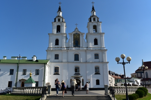 スヴィスラチ川沿いの小高い丘の上に建つ聖霊大聖堂は、二つの搭をもつ緑屋根の正教会です。1633年にカソリック教会の修道院として建てられましたが、1852年にロシア正教の教会になりました。この壮大な大聖堂の内部には数々のイコンが飾られており、その中で最も有名なものは「ミンスクの聖母」です。1482年に現キエフがモンゴルに襲われた際、このイコンは川に投げ捨てられたのですが、なぜか上流のミンスクへ流れ着いたとか。この出来事以来、奇跡を起こすイコンとして信じられています。