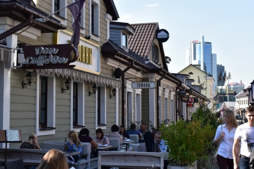 聖霊大聖堂の北方、スヴィスラチ川にかかる橋を渡ると、トラエツカヤ旧市街区があります。「トラエツカヤ」とは、「聖三位一体」の意味で、かつてここにあった教会に由来した名称です。戦争で焼け野原になったこの地域でしたが、学生ボランティアたちの手によって当時の商家などがそっくり再現されました。現在は、カフェやお土産屋さんの並ぶ、ほっこりした街並みで、夜になっても地元の人々や観光客で賑わっています。