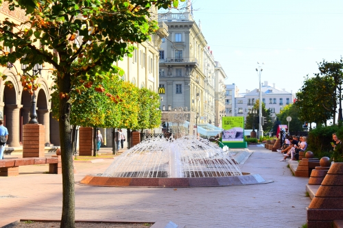 街の中心地にあるJanki Kupaly Parkは、森の中にモニュメントが点在しており、その先には高級デパートなどが立ち並びます。