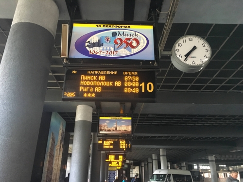バス乗り場10番にバスがいました。電光掲示板にもレシートに書いてある行先の文字があります。バスに乗るとき、このレシートを運転手さんに見せるので、もし違っていたら教えてくれます。また、念には念を入れて「ネスヴィジ!」と言うのも良いと思います。運転手さん含め周りの人が、近づいたら教えてくれます。(本当にベラルーシの方々は優しい!)