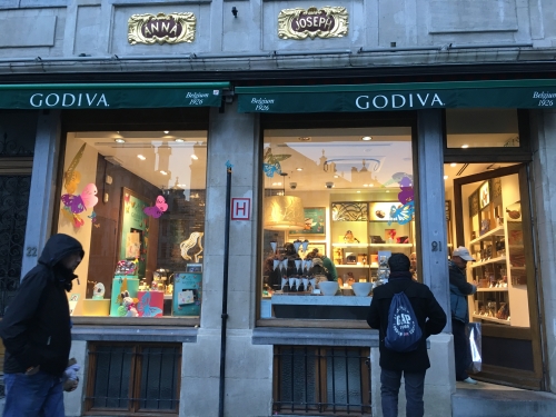 日本でもおなじみのゴディバの本店。生のイチゴにチョコレートをディップした「ストロベリーコーン」というメニューがグラン・プラス店の名物です。日本ではあまり見かけないチョコレートも購入できます。