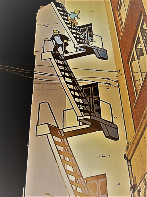 等身大のタンタンとハドック船長、犬のスノーウィが描かれた壁画