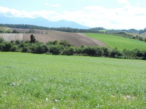 丘越しに、十勝岳連峰や大雪山系の雄姿を望む事ができるスポットです。丘と山、そして防風林として植えられているカラマツとのコントラストが楽しめる場所でもあります。