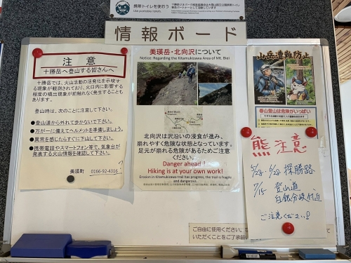 玄関に入山ポストがあるほか、クマの出没情報なども掲示されているので、登り出す前にぜひ立ち寄ってみて下さいね!