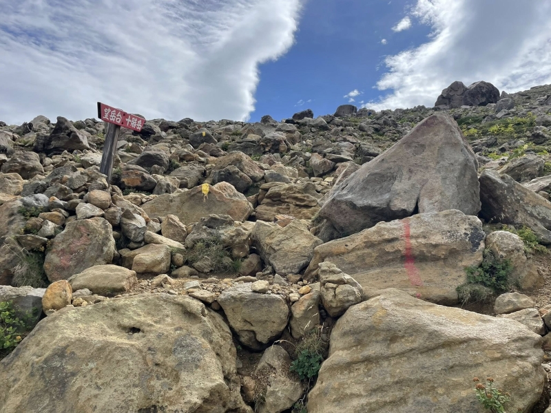 避難小屋を過ぎると、登山道の様子は変わりはじめ、大きな岩がゴロゴロと転がる登山道を登っていきます。
