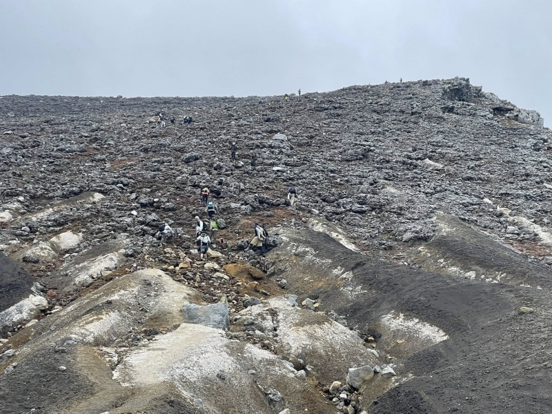火山れきの急斜面を登りきると、風景はがらりと変わり、モノトーンのれき地が広がります。