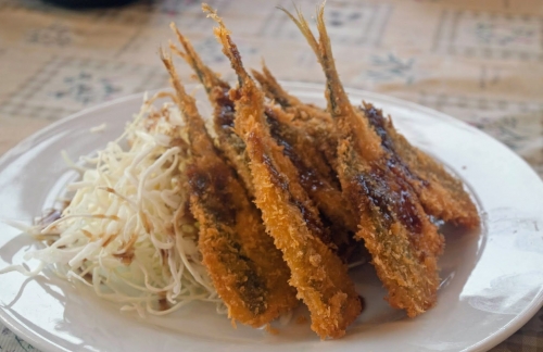 鋸山の麓にある、黄金アジが食べられることで人気の連日行列が絶えないお店です。一番人気はアジフライのほかにアジのお刺身を楽しめる「さすけ定食(1,500円)」。ご飯とお味噌汁、冷奴とお漬物がセットになっています。