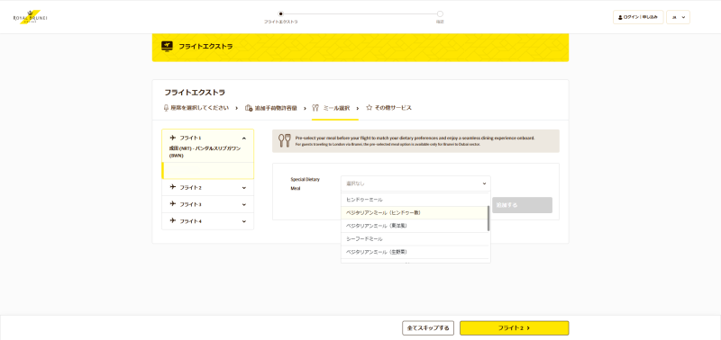 ③“ミール選択”をクリックすると選択可能なミールが出てきますので、お好きなものを選択してください。特別機内食の種類や詳細は公式サイト(英語表記)から確認できます。