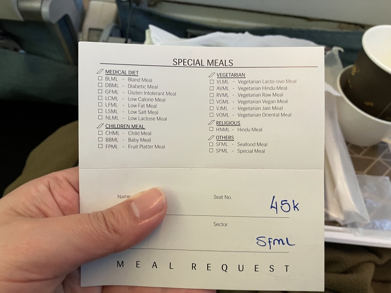 筆者は他の航空会社でもシーフードミールに事前変更しておくことが多いです。お肉系の機内食は当たりはずれがあって、ハズレになると脂っこかったり味付けが合わないこともあるのですが、個人的にシーフードミールは海外発の便でも満足できる場合が多い気がします。