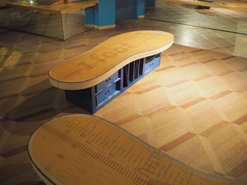 上の写真は、ドールハウス用の靴や物語に登場する靴など、サイズ感の異なる靴がずらりと展示されている様子。それらを、靴底の形のベンチに座って眺めます。