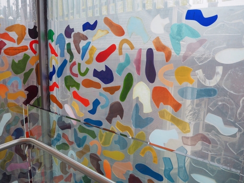 左は1階のショップで買える靴のチャーム。ここだけのグッズ感があってかわいいですよね。右は館内の窓の一角。さまざまな”靴跡”があり、子どもでも楽しめるコーナーです。