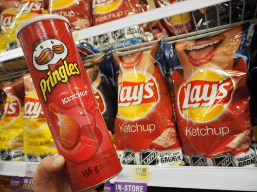 チップス系お菓子は、誰でも満足度の高い定番スナック。カナダではなぜかケチャップ味のポテトチップスが、どのコンビニやスーパーでもメインの位置に鎮座しているので、カナダらしいお菓子のひとつと言えます。