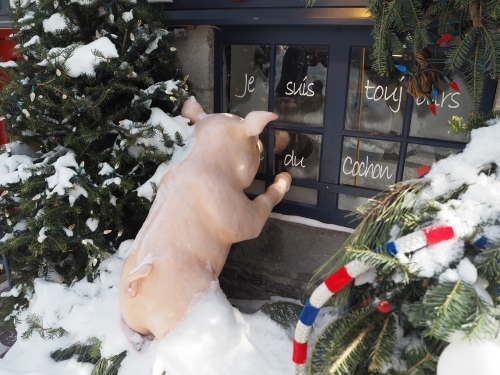 ちなみに向かいには「Le Cochon Dingue(ル・コション・ダング)」という、こちらはフランス語で子豚の意味のカフェレストランがあります。同じようにお店の外に子豚がいて、姉妹店かな?と思うような共通のほのぼの感がたまりません。
