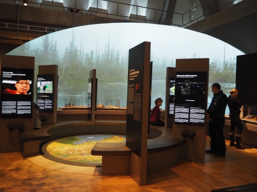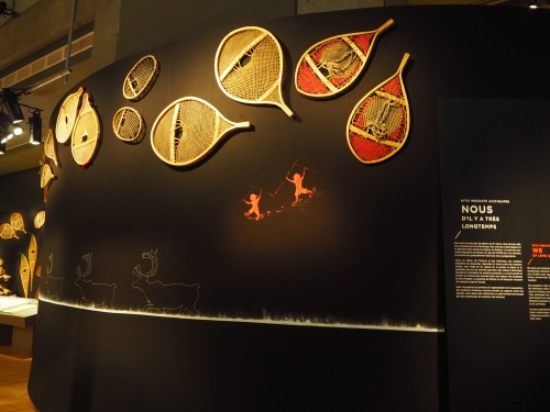 先住民族の文化、フランスによる支配の影響、産業革命など、多くの日本人が抱いているカナダのイメージとは異なる「文明」について詳しく知ることができます。イラストや映像を使ったコンテンツがたくさんあり、子どもも大人楽しめて、古都ケベックの観光の充実度もアップするはず。下の左の写真は、スノーシューという先住民が使っていた"かんじき"の展示です。