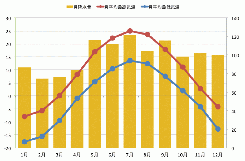 | 月平均最高気温(観測値) | 月平均最低気温(観測値) | 月降水量(平年値) | |