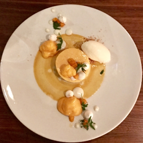 右の写真はシーバックソーン プリン。シーバックソーン(Sea buckthorn)とは、栄養価が高いためによく健康食品のサプリメントとして使用されるオレンジ色果実。マドレーヌとバターミルクアイスと一緒に添えられていて、さっぱりシトラス系の後味がいいデザートです。