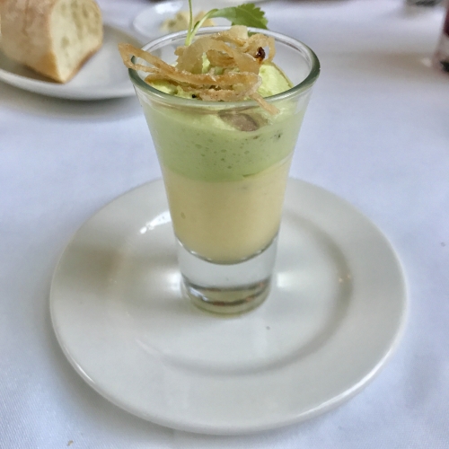 まず最初に、突き出しのアスパラガスと卵のムース(写真左)は、ふわふわな2層のムースとトッピングされているクリスピーオニオンが一体化して、なんとも言えない食感と繊細な味。次のコースメニューは、野菜のクリームスープ(写真右)。数種類の野菜と生ハムをブレンドして、バルサミコ酢とパルメザンチーズのエスプーマ(泡)で仕上げた上品な優しい味のスープです。