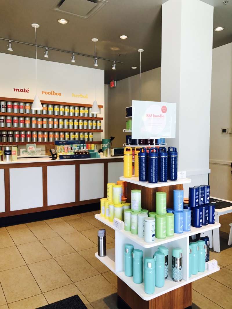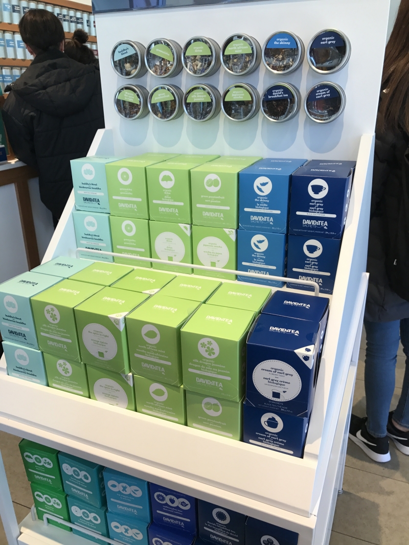 3軒目がこちら。青い看板、スタイリッシュな外観が目を惹く「DAVIDs TEA」は、様々な茶葉・ハーブはもちろん、ドライフルーツやナッツ、キャンデーなどがミックスされたお茶など個性あふれる味が楽しめます。