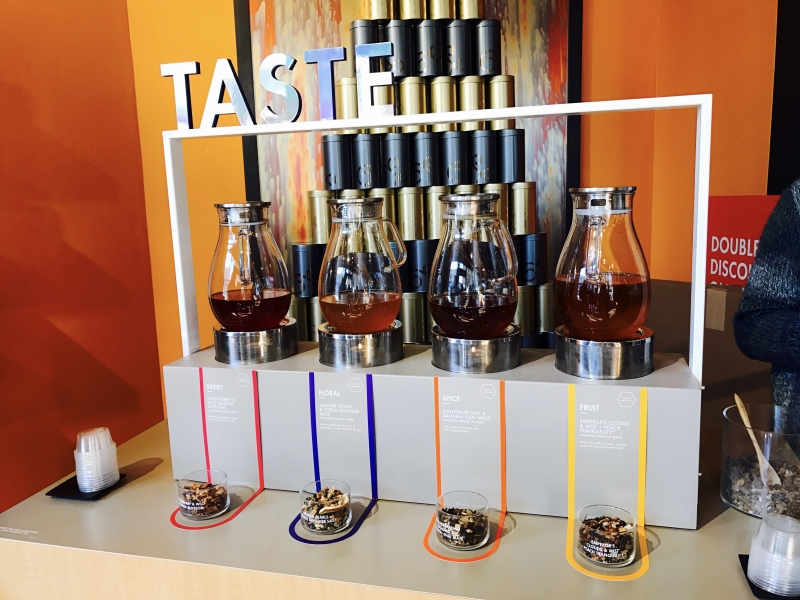 この日はホット3種類とアイス1種類が用意されていました。どれもフルーティーで甘みがあり一度に数種類のお茶が試飲できるのは飲み比べも楽しく、お得な気持ちになれます。ティーポットの隣には砂糖の変わりにビーツでできた甘味料が置かれており甘さを調整することもできました。