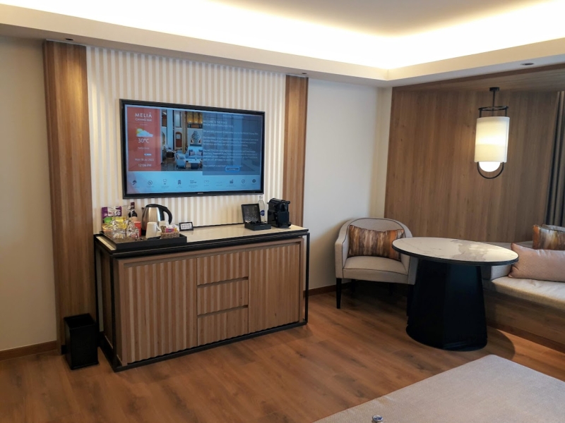 「メリア・チェンマイ」は、古い建物を改装しているため、客室の天井はやや低めです。壁の一面にはもともとあったと思われるやや小さめの窓があります。その下には、デイベッドにもなる長いソファーが配置され、寝転んだり、外の景色を眺めたりすることができます。部屋の中央のベッドの手前にも大きなソファーがあり、広い部屋ですがガランとならないように工夫されています。
