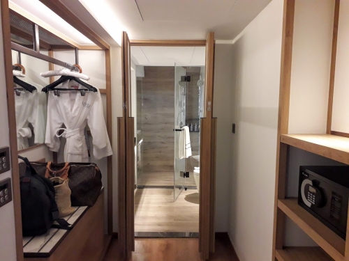 クローゼットはオープンタイプで圧迫感はありません。バスタブはありませんが、とても広いシャワーブースになっています。