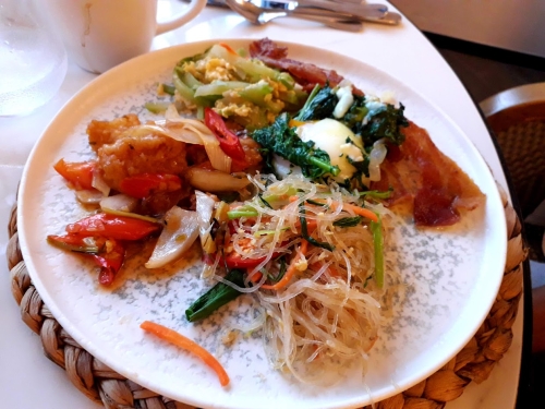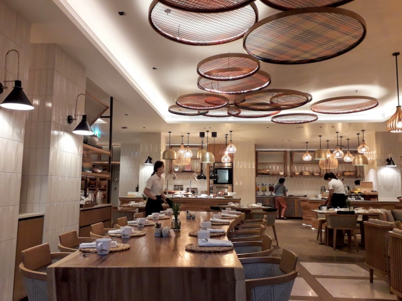 朝食は、1階にあるレストラン「ランナーキッチン」での朝食ブッフェを選択しました。朝は朝食会場になっていますが、「ランナーキッチン」は地中海料理専門店です。とても広く明るい空間で、店内のあちこちにチェンマイの工芸品を模したオブジェが飾られています。