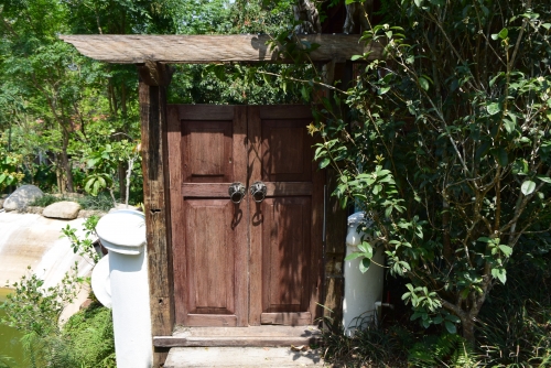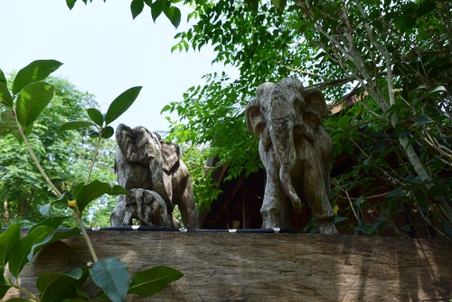 今回愛犬と宿泊した筆者は、ペットと宿泊ができるヴィラタイプの部屋を選択。タイの古民家によくある、古い米蔵を移築・改装したヴィラです。それぞれのヴィラの入り口には木の扉があり、隠れ家の雰囲気が出ています。木彫りの像もかわいらしいです。リゾート内には5棟のヴィラがありますが、筆者が宿泊したのは一番小さな「チャンカエウ・ヴィラ」です。