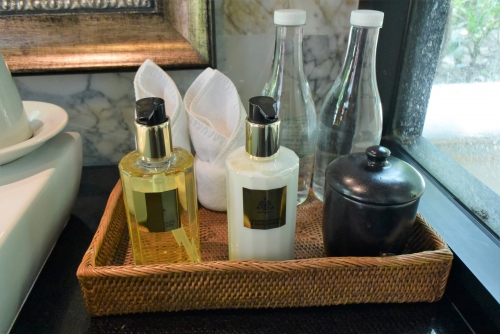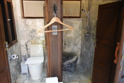 バスルームは石のタイルが張られ、清潔です。アメニティはタイの高級スパブランド「HARNN」。とても良い香りに癒されます。
