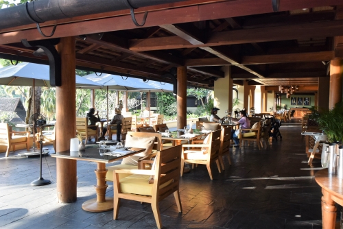 筆者が訪れた日はとても暑かったので、室内の席を選びました。エアコンが効いた室内は、大きなシャンデリアと、リゾート内の景色や施設が描かれた大きな絵が印象的な空間です。大きなガラス窓もあり、遠くの田んぼと周囲の庭の樹木が見えます。