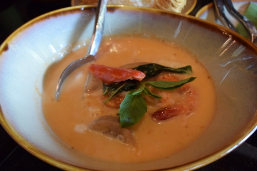 次に来たのは、「レッドカリー・シーフード」です。辛さは注文時に希望を伝えることができます。筆者はタイでの普通の辛さでオーダーしました。辛みの中にもフレッシュなココナッツミルクの甘みがあって、シーフードのうまみが凝縮されているおいしいカレーです。こちらにも大きなエビがたくさん入っていました。