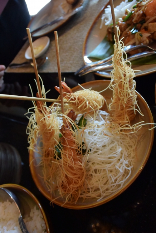 「グン・サロン」は、オイスターソースであえたエビを、米麺で巻いて揚げた料理です。パリパリの米麺の衣がおいしい一品です。