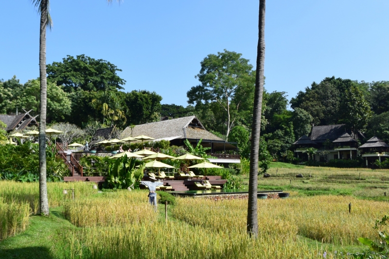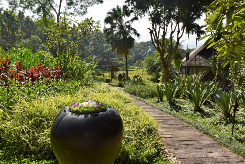 食後、ホテルの庭園を少し散歩させていただきました。本当によく手入れされていて、草一つ、ごみ一つない、とても気持ちの良い庭です。庭を管理するたくさんのスタッフがいるのですが、昔ながらのタイの農民の格好をしているので、田園の景色にうまく溶け込んでいます。すれ違う時には気持ちよく「サワディーカー」(こんにちは)と挨拶してくれます。