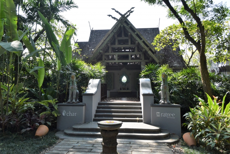 庭園の中ほどに、宿泊者のためのプールがあります。入口の両脇には、バーと、ホテルのもう一つのレストラン「チャー」のサインが表示されています。
