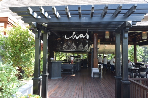 プールサイドのバーでは、カクテルなどのドリンクが提供されます。レストラン「チャー」は、プールの奥の方にあります。