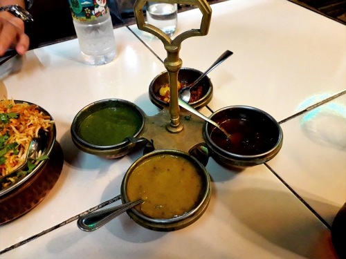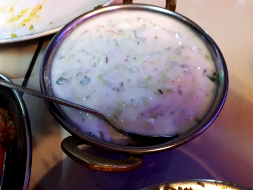 付け合わせのソースやピクルスを足していただくと、味の変化を楽しめます。白いソースはヨーグルトで、きゅうりやパセリが入っています。そのまま食べても美味しいですし、カレーにかけると爽やかな味になります。