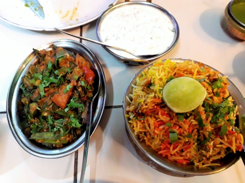 「ラチャダーバー」では、カレー以外にも美味しいメニューがあります。こちらはインド版炊き込みご飯「チキンビリヤニ」です。パスタのように長いインド米が、カレーによく合います。