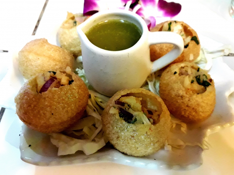 そして、筆者が初めて出会った「パニプリ」です。インドでは屋台で売られているスナックなのだそう。カリカリの丸い生地の中には、潰したジャガイモと玉ねぎ、スパイスが入っています。真ん中にあるスパイシーなスープを入れていただきます。口に入れると、中のスープが一気に口に広がり、思ったよりクセがなく、とても美味しいです。