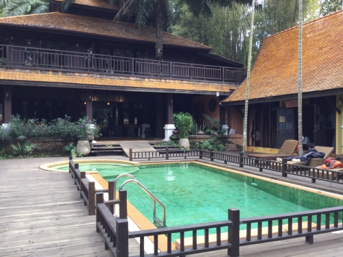 料金を支払ったら、プールがある庭を過ぎていきます。プールの脇にある建物は、タイマッサージの施術が受けられる部屋になっています。マッサージは1時間300バーツ(約1,030円)。入浴とセットで申し込むと、500バーツ(約1,720円)です。
